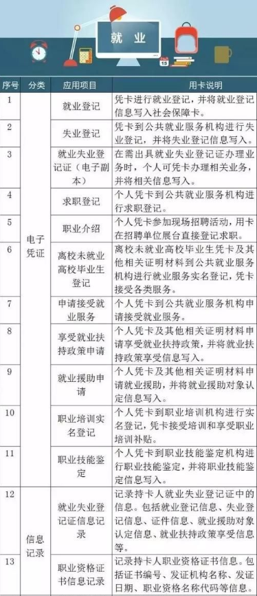 持卡办理就业登记、失业登记、参保登记、工伤认定、职业培训、技能鉴定等人社业务享受全方位的人才服务、就业服务、社保服务、各项就业创业政策扶持。