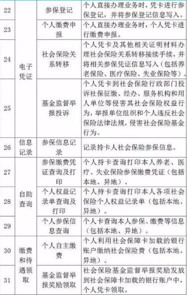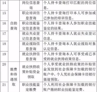 通过社会保障卡的金融账户实现各类缴费和待遇领取包括个人各项社会保险缴费、人事人才考试缴费、各项社会保险定期待遇和一次性待遇领取、报销费用领取、就业扶持政策补贴资金领取等。