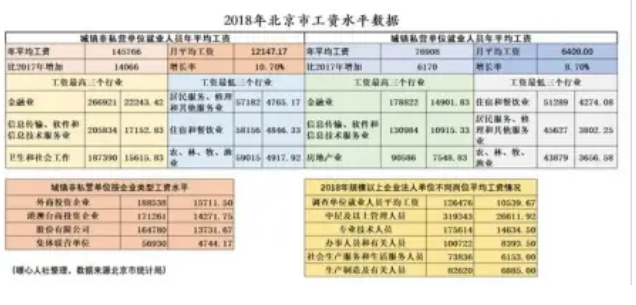 实际上,北京市的社会平均工资确实早就超过了万元,但是前提要搞清楚,是城镇非私营单位就业人员平均工资。2018年是每月12147元。像金融业平均工资高达2.2万元,信息传输、软件和信息技术服务业以及卫生和社会工作平均工资也高达1.7万和1.56万元。但实际上,还有私营单位在岗职工社会平均工资呢?私营单位在岗人员的平均工资只有6400多元。