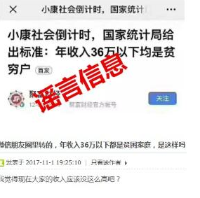 12月11日(左宇坤)11日,国家统计局官方公众号就网络流传的“国家统计局给出标准:年收入36万以下均是贫困户”信息进行回应,国家统计局从未提过上述家庭标准!我国只有现行国家农村贫困标准,也就是:基本生活消费低于每人每年2300元(按2010年不变价),按此标准测算,2018年末,全国农村贫困人口1660万人,比上年末减少1386万人。