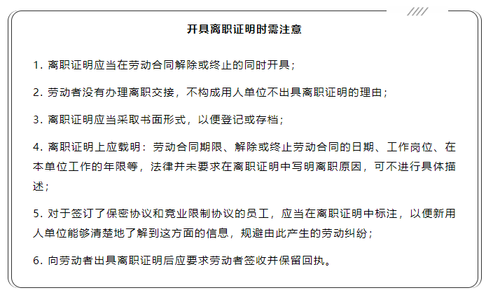 (2)《劳动合同法实施条例》第24条规定:用人单位出具的解除、终止劳动合同的证明,应当写明劳动合同期限、解除或者终止劳动合同的日期、工作岗位、在本单位的工作年限。