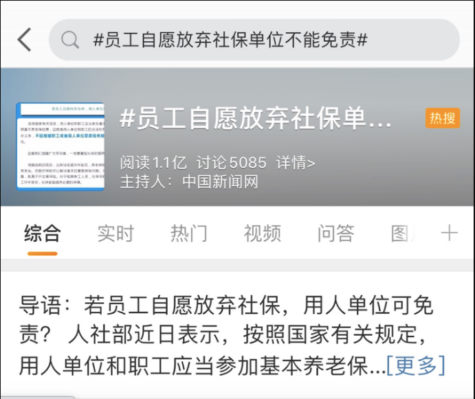 近日,相关话题又引起了网民讨论,员工自愿放弃社保单位不能免责的话题上了微博热搜。