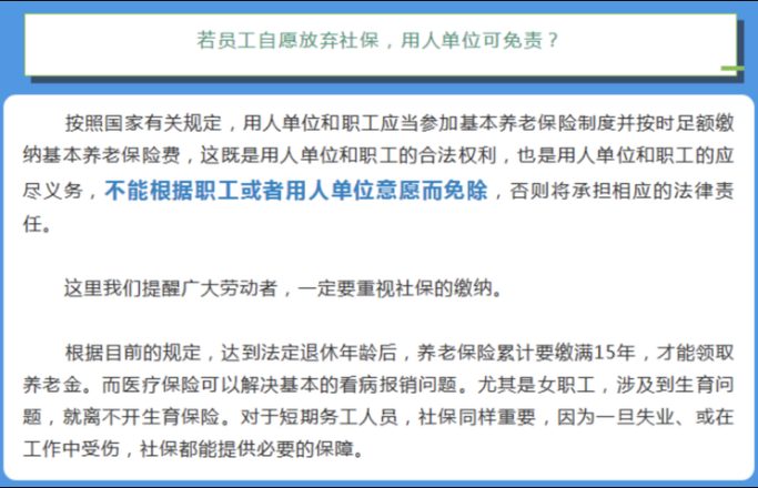 人社保官方表示:员工自愿放弃社保,用人单位不能免责!员工也要搞清楚:自愿放弃缴纳社保,离职时单位无须支付经济补偿金。
