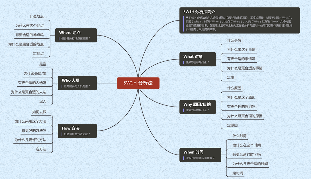 小编在这里推荐一个“5W+1H”分析法,可以有效帮助大家认清自身角色,提高工作效率。