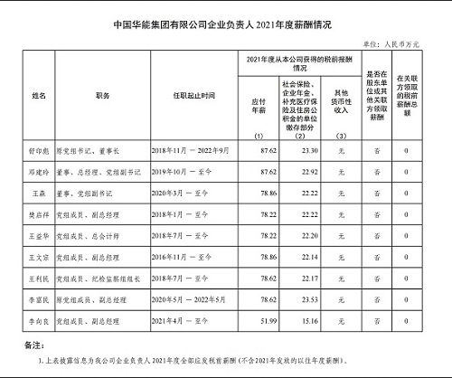 2023年1月28日,中国华能集团有限公司披露《中国华能集团有限公司企业负责人2021年度薪酬情况》。原党组书记、董事长舒印彪在2021年度从华能集团获得的税前应付年薪为87.62万元。