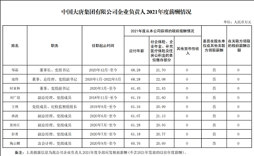 1月29日,中国大唐集团有限公司披露企业负责人2021年度薪酬情况。大唐集团董事长、党组书记邹磊年薪68.28万元。