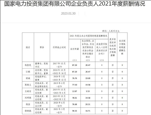 1月30日,国家电力投资集团有限公司披露企业负责人2021年度薪酬情况。国家电投董事长、党组书记钱智民年薪87.2万元。
