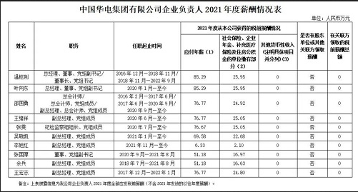 1月30日,中国华电集团公布企业负责人2021年度薪酬情况表。中国华电董事长、党组书记温枢刚年薪85.29万元。
