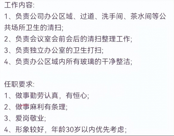 形象好。年龄30岁以后优先考虑"这一任职要求,也引发广大网友热议。不少网友表示,又不是用脸扫地,要求"形象好"太离谱,也有认为保洁员都要优先选择30岁以下了,太苛刻。