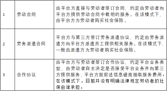 根据《指导意见》的规定以及目前实践中常见的情形,平台方目前与劳动者签订的合同主要为三种: