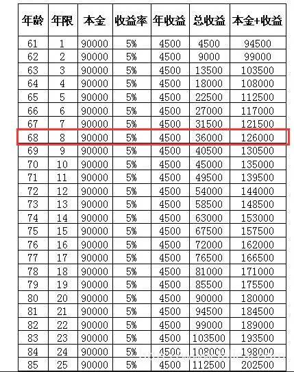 以上可以看出,大约第八年的时候,投资收益+本金与领取到的养老金大约持平,也就是爸妈68岁左右的时候,可以把养老金赚回来。