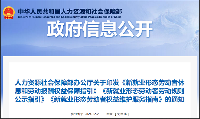 2月23日,人力资源和社会保障部发布《新就业形态劳动者休息和劳动报酬权益保障指引》《新就业形态劳动者劳动规则公示指引》《新就业形态劳动者权益维护服务指南》等三份新办法,将从事网约配送、出行、运输、家政服务等的新就业形态劳动者纳入最低工资保障,是这次新规带来的最大变化之一。