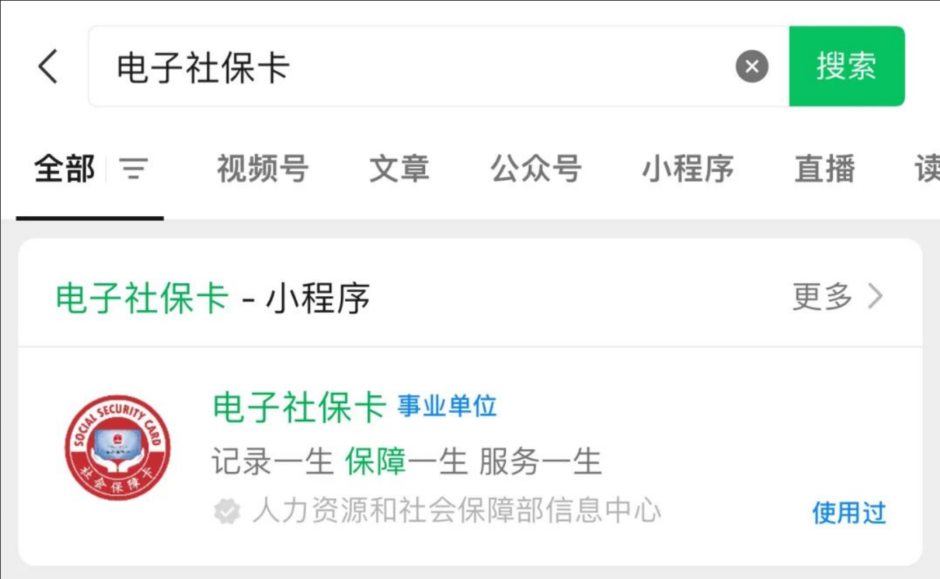 第一步:微信搜索“电子社保卡”(温馨提示:还没领卡的小伙伴赶快注册申领哦,“电子社保卡”在生活中使用能够提供很多便利~)