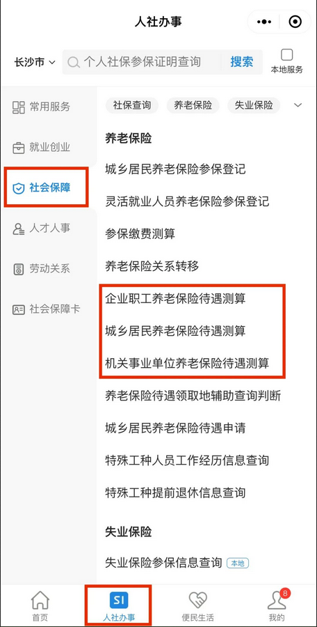 首页点击“人社办事”,在“社会保障”分类下找到“养老保险待遇测算”。