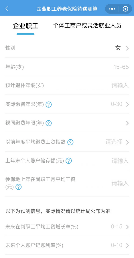 根据本人实际情况,选择企业职工养老保险待遇测算、城乡居民养老保险待遇测算、机关事业单位养老保险待遇测算,进入界面填写参数。