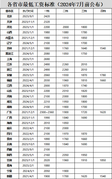 全国各省市最低工资标准(2024年-持续更新)