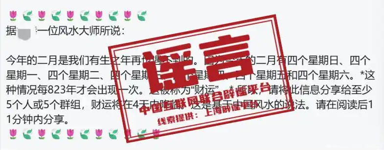 真相:这些言论是典型的网络谣言。平年的2月都有28天,正好是4个完整的星期,这28天里必然包含4个周一、4个周二……直到4个周日。不用间隔823年,任何一个平年,都符合网传信息所谓的“特殊”要求。可见,“特殊月份”压根不特殊,“823年才能遇到一次”更是无稽之谈,与财运等迷信说法无关。类似谣言不是第一次出现,每隔数年就有一个新版本,其实是把常见的历法现象包装成难得一遇的情况,再通过“转发获财运”诱导话术传播,实现网络营销。(来源:“上海网络辟谣”微信公众号)